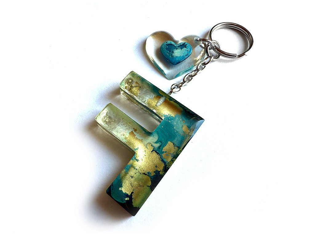 Přívěšek písmeno F se srdcem z pryskyřice na klíče nebo kabelku .