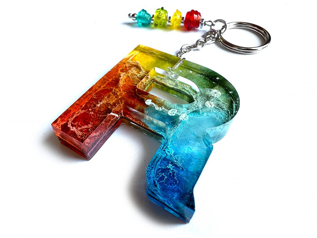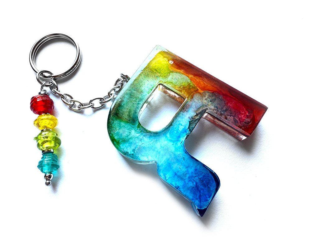 Přívěšek písmeno R z pryskyřice na klíče nebo kabelku s vinutými perlami.