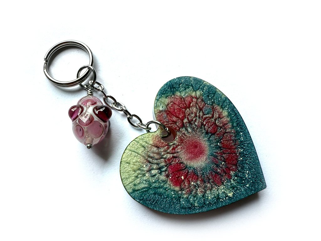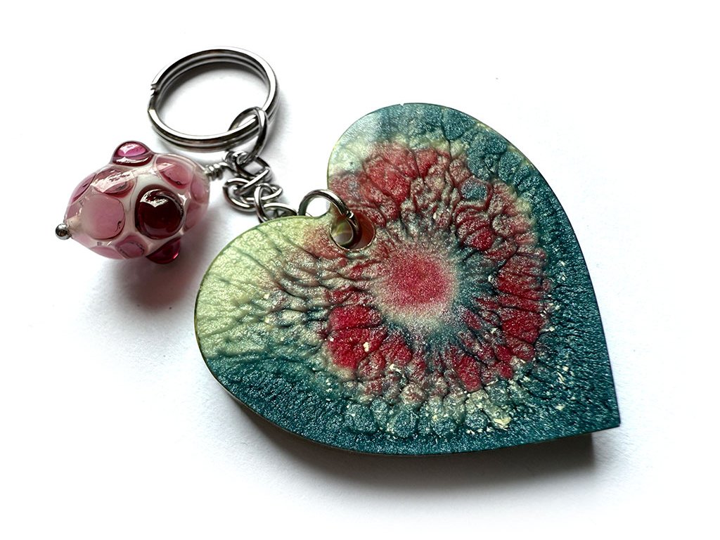 Přívěšek srdce z pryskyřice na klíče nebo kabelku s vinutkou.