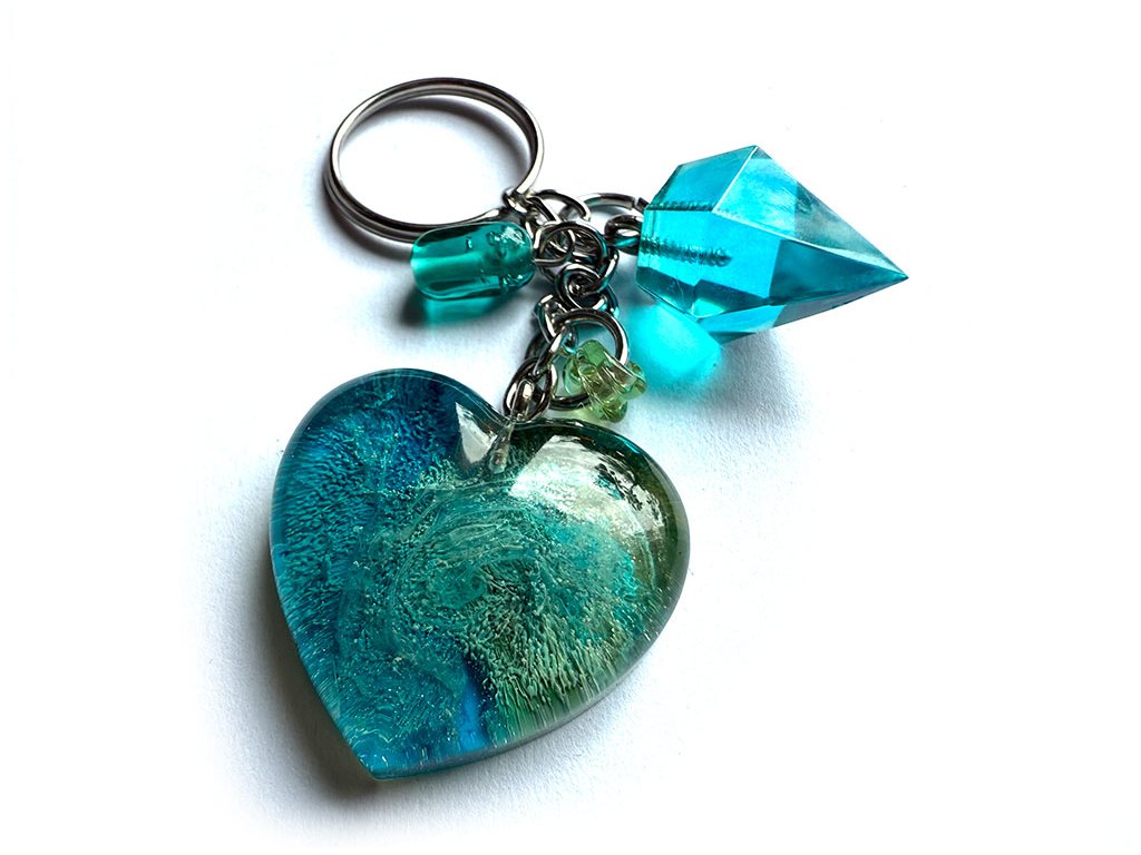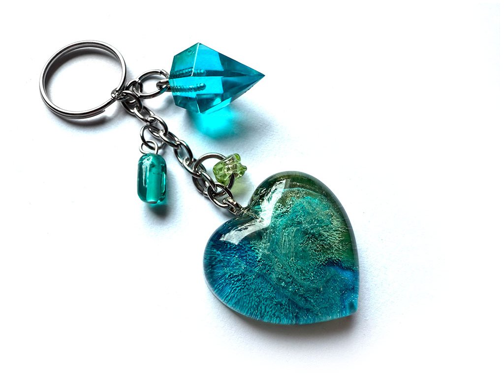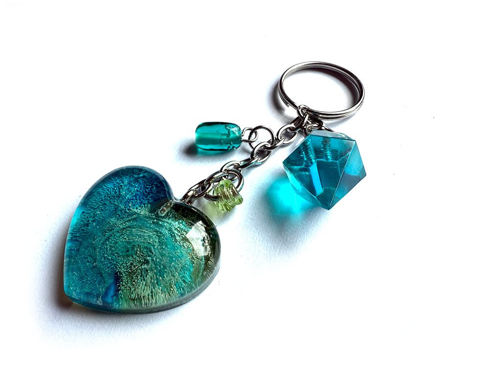 Přívěšek srdce z pryskyřice na klíče nebo kabelku s diamantem a vinutkami.