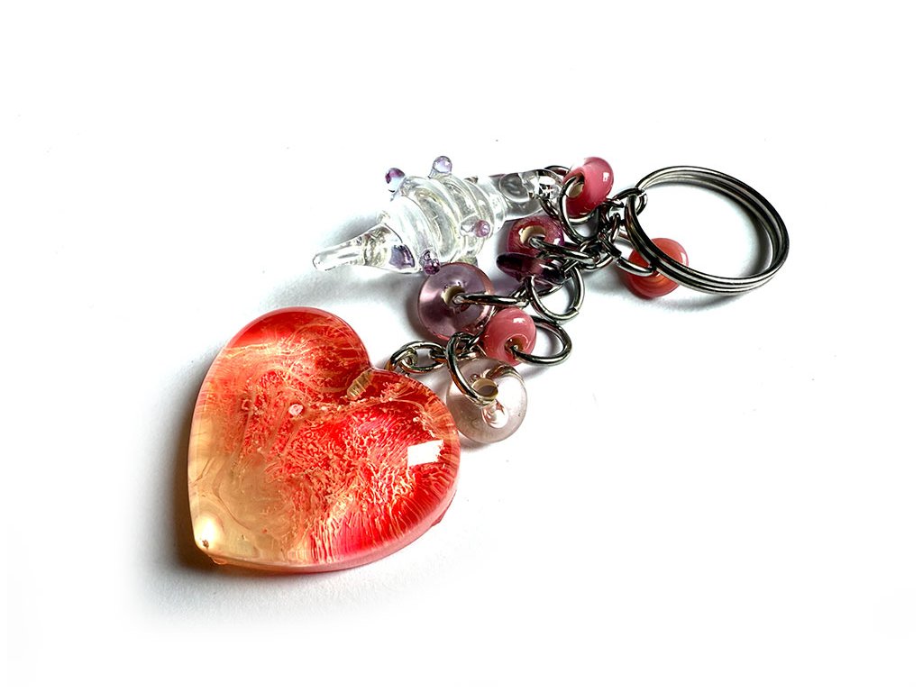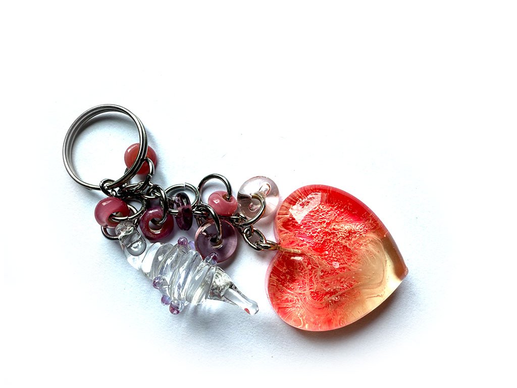 Přívěšek srdce z pryskyřice na klíče nebo kabelku se skleněným rampouchem a vinutkami.