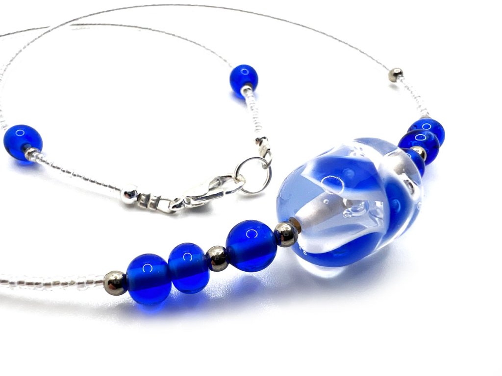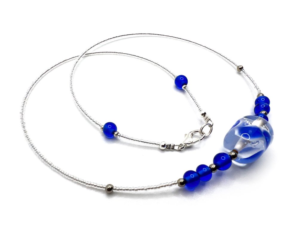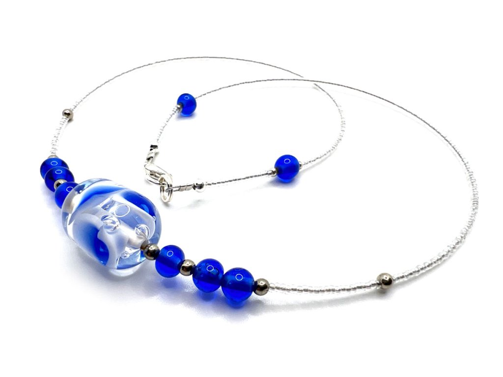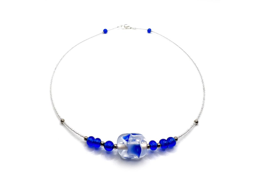 Modrý náhrdelník ze skleněných vinutek a maličkatých rokailů.