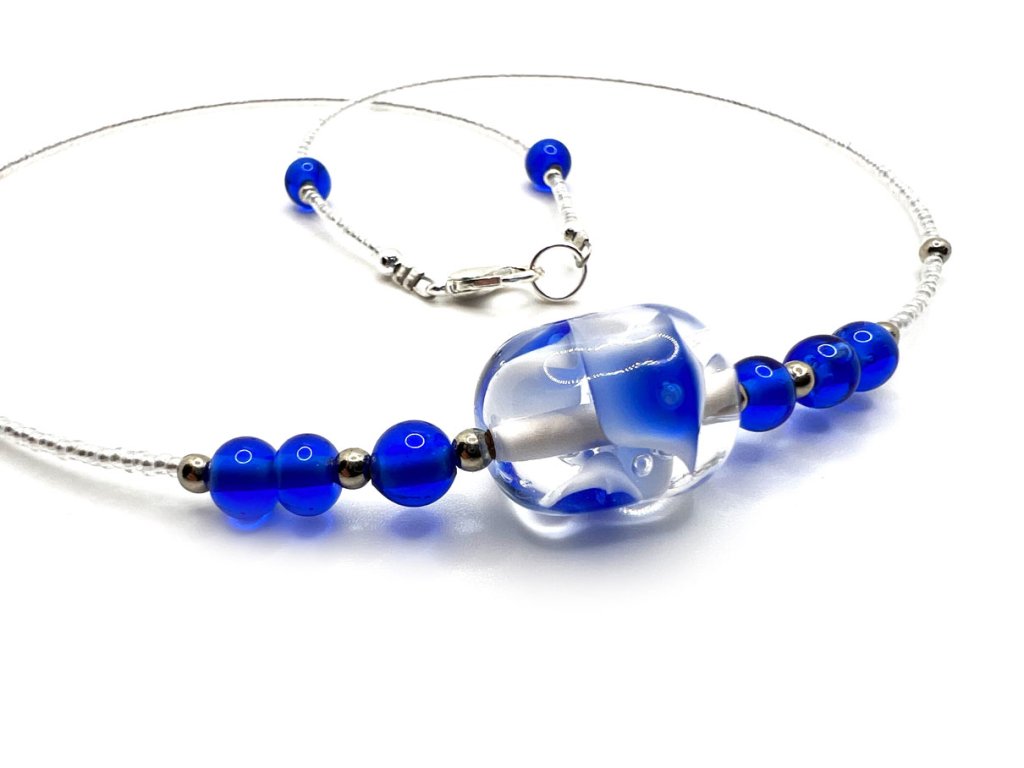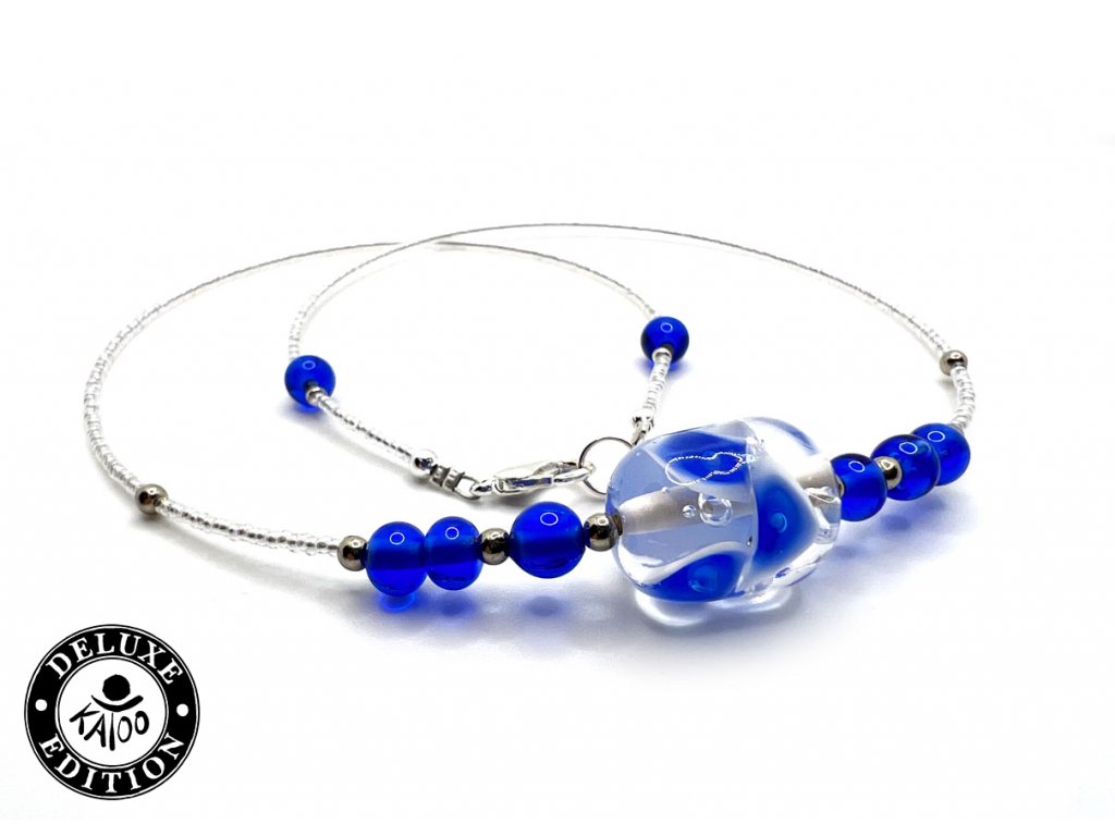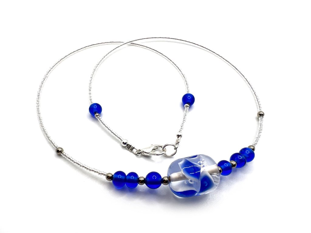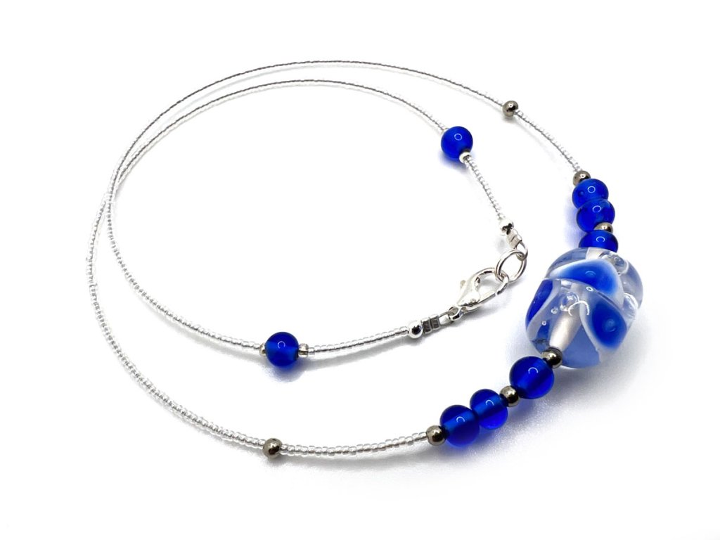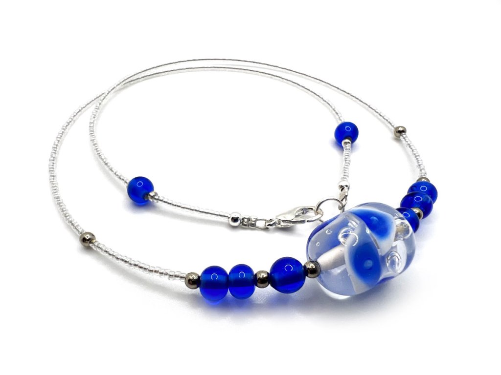 Modrý náhrdelník ze skleněných vinutek a maličkatých rokailů.