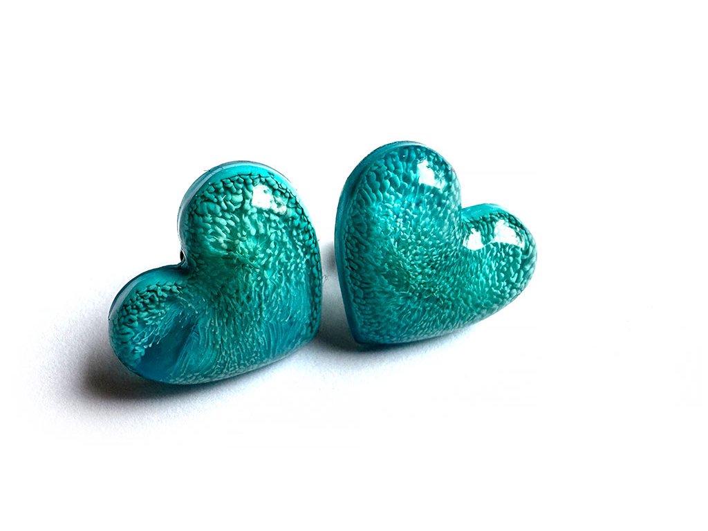 Puzetové náušnice z pryskyřice ve tvaru srdíčka s 3D tvarovými efekty.
