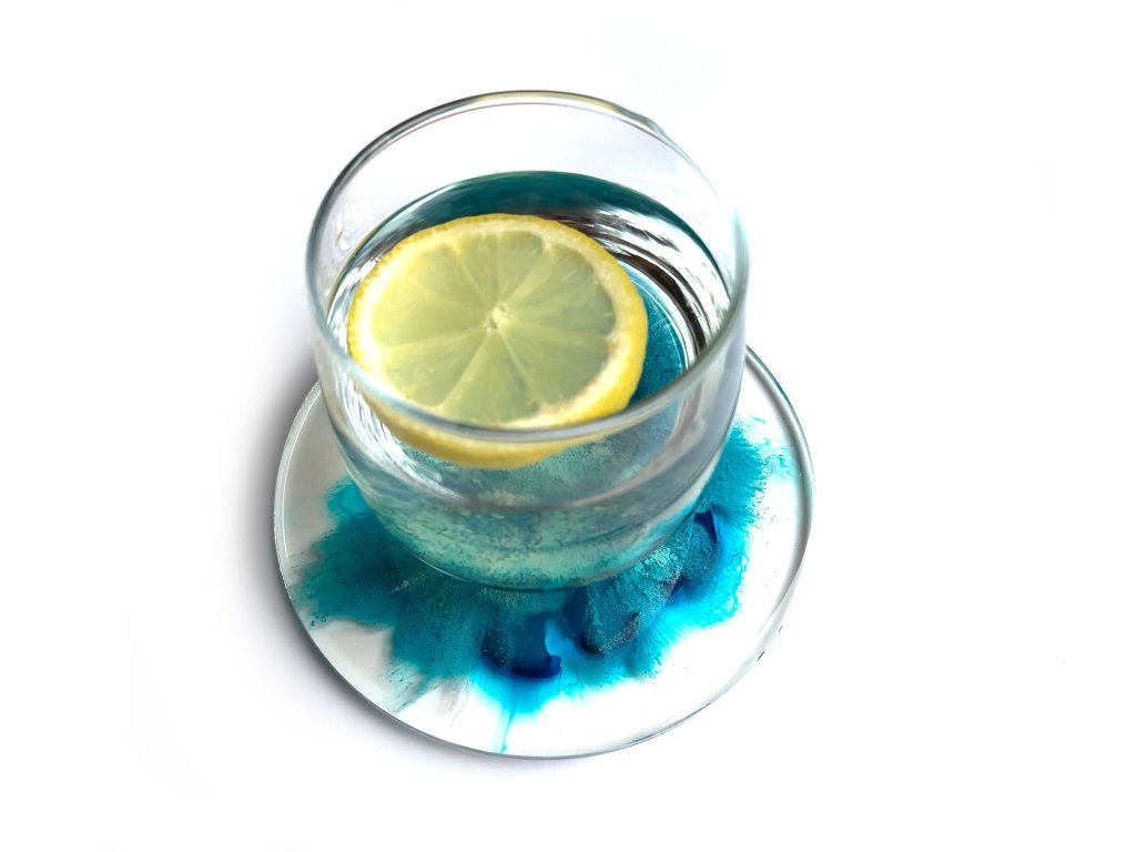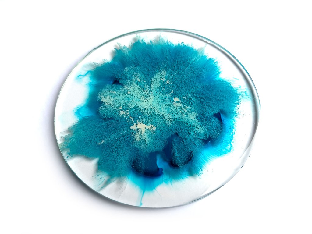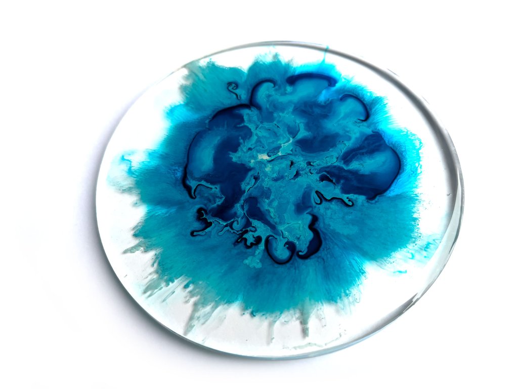 Podtácek pod hrneček z lité pryskyřice s modrým tvarovým efektem.