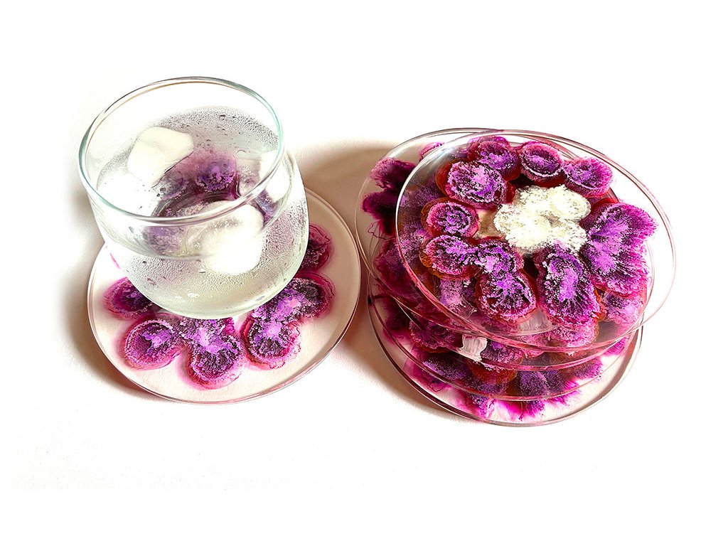 Šest podtácků z pryskyřice s fialovými efekty.