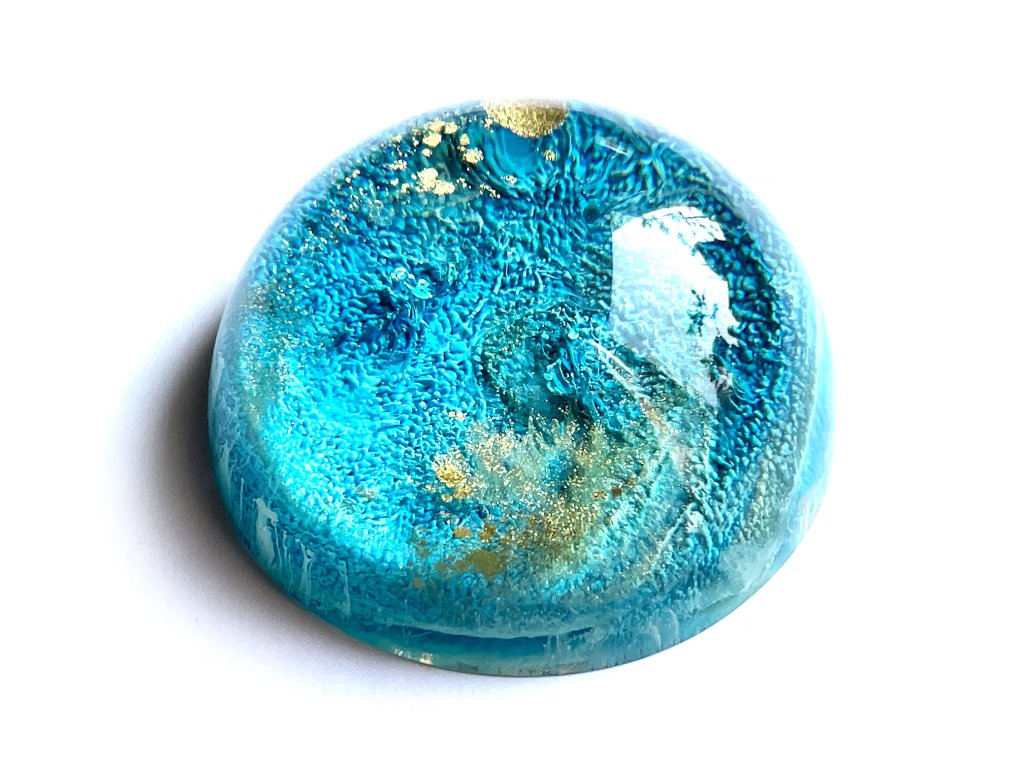Těžítko z pryskyřice ve tvaru polokoule s tajemnými 3D efekty.